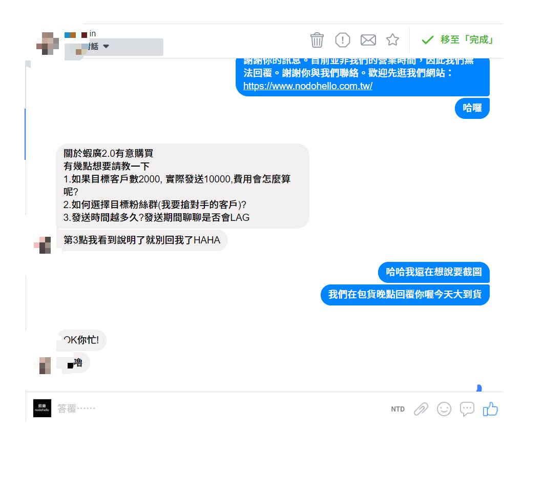 A:2020/8/14更新回答:已精進程式,現在不論你是否有現成的名單,都可以馬上在30分鐘內開始發送廣告。(除非伺服器全都在跑別人的蝦廣委託案)